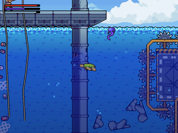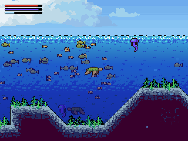 The 3 bars at the top-left represent your health (red), food (purple) and air (blue). Avoid obstacles to preserve your health. Food depletes over time as you move around. Eat jellyfish to replenish it. Air depletes over time, swim to the surface to replenish it. If you ran out of food or air you won't be able to perform certain movements and you will lose health over time. If your health reaches 0 you will die.
